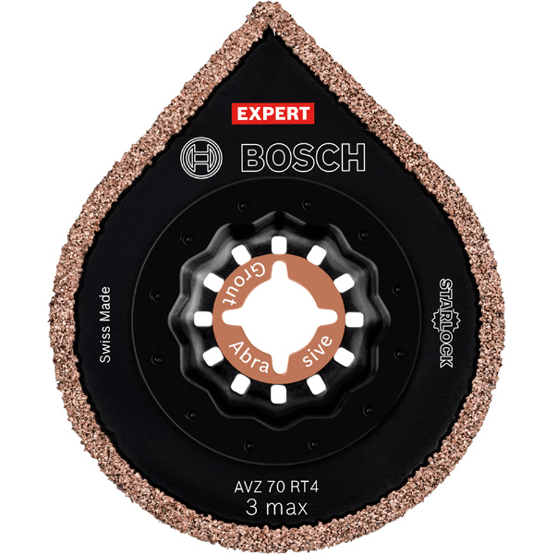 Mehrzwecknutzung in Fliesen! Erreicht mit der Spitze jede Ecke Das Entfernen einer beschädigten Fliese, ohne die gesamte Wand neu gestalten zu müssen, ist einer der großen Vorteile der Starlock-Multifunktionswerkzeugs – und mit dem EXPERT AVZ 70 RT4 3 max ist es noch einfacher. Mit diesem einen genialen Blatt kannst du alten Fugenmörtel enfernen und dabei selbst schwer zugängliche Ecken erreichen. Nach dem Enfernen der Fliese kann der Fliesenkleber bis in die Ecken abgeschliffen werden. Dies ist das Blatt für oszillierende Multifunktionswerkzeuge, das für Fliesenarbeiten benötigt wird: ein einfaches Design, das deine Arbeit erleichtert und maximale Effizienz gewährleistet. Mit der Bosch EXPERT AVZ 70 RT4 3 max hast du immer das richtige Starlock-Zubehör zur Hand. Spare Zeit und Geld mit einem Multifunktionszubehör
