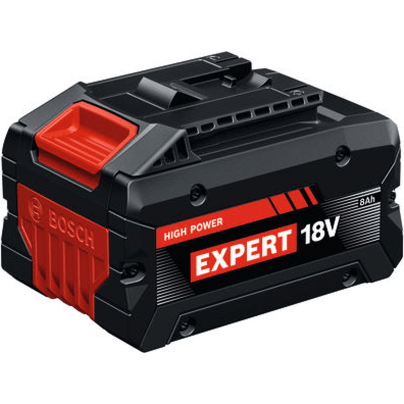Akkupack EXBA18V-80, Der leistungsstarke Akku EXBA18V-80 liefert bis zu 120 % mehr Laufzeit für hervorragendes kontinuierliches Arbeiten selbst in harten Anwendungen (verglichen mit Professional GBA 18V 4.0Ah. interner Labortest. Schleifen auf Weichstahl mit GWS 18V-15 S + Fächerscheibe, Intervalle von 30 s mit 5 s Pausen). Er basiert auf fortschrittlicher „Tabless“-Zelltechnologie für eine Maximalleistung von bis zu 2400 W (interner Labortest. sofortige Maximalleistung, voll geladener, neuer Akku). Konventionelle Akkus besitzen „Multi-Tab“-Zellen, die nur zwei Tabs zur Stromleitung nutzen. Dies führt zu einem Engpass, der den Widerstand des Akkus vergrößert. Die „Tabless“-Zelltechnologie beseitigt diesen Engpass. Statt lediglich zwei Strompfaden bietet sie unzählige parallele Strompfade. Das Ergebnis: geringerer Widerstand, weniger Wärme, extreme Laufzeit und maximale Leistung. Mit seinem verstärkten robusten Gehäuse, dem ausgezeichneten Wärmemanagement mit COOLPACK 2.0 und „Tabless“-Zelltechnologie bietet der EXBA18V-80 eine lange Lebensdauer und ist deshalb ideal für Profis, die Langlebigkeit und hohe Leistung benötigen. Der EXBA18V-80 hat einen vergrößerten Ladetemperaturbereich von -10 °C bis +55 °C Akkutemperatur bei Verwendung mit EXAL18V2-320 oder EXAL18V-160. Er besitzt eine 5-LED-Anzeige für den Ladezustand mit Restkapazität und Defektrisikoerkennung. Kompatibel mit dem Bosch Professional 18V System und der markenübergreifenden AMPShare Akku-Allianz. Er kann mit dem EXAL18V2-320 oder EXAL18V-160 in lediglich 39 Minuten vollgeladen werden und wiegt nur 1,04 kg. Karton