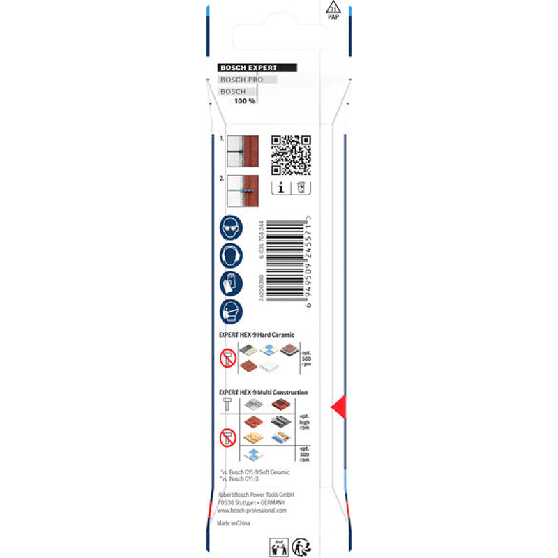 Lange Lebensdauer in Hartkeramik und Präzision in Baumaterialien! Präzises Anbohren von Löchern dank einer speziell konzipierten Zentrierspitze Beim Bohren in Fliesen können Sie das Loch präzise anbohren, ohne dass die teure Fliese Schaden nimmt. Sobald die Fliese durchbohrt ist,benötigst du für die darunterliegenden Werkstoffe einen Multimaterialbohrer. Für diese Aufgaben haben wir den Bohrersatz EXPERT HEX-9 Hard Ceramic und Multi Construction entwickelt, mit dem du beide Aufgaben problemlos bewältigen. Das Set mit EXPERT HEX-9 Hard Ceramic und Multi Construction enthält Bohrer, mit denen sich problemlos zwei grundverschiedene Aufgaben bewältigen lassen. Dank unserer Carbide Technology ist die EXPERT HEX-9 Hard Ceramic außergewöhnlich robust und langlebig: Damitkannst du auch die härtesten Keramikfliesen anbohren. Der EXPERT HEX-9 Multi Construction ermöglicht dank der Bosch Centering Geometry das präzise Anbohren aller gängigen Baumaterialien hinter den Fliesen – damit kannst du die Löcher genau dort bohren, wo sie sein sollen. Außergewöhnlich ausdauernder Bohrer mit Bosch Carbide Technology